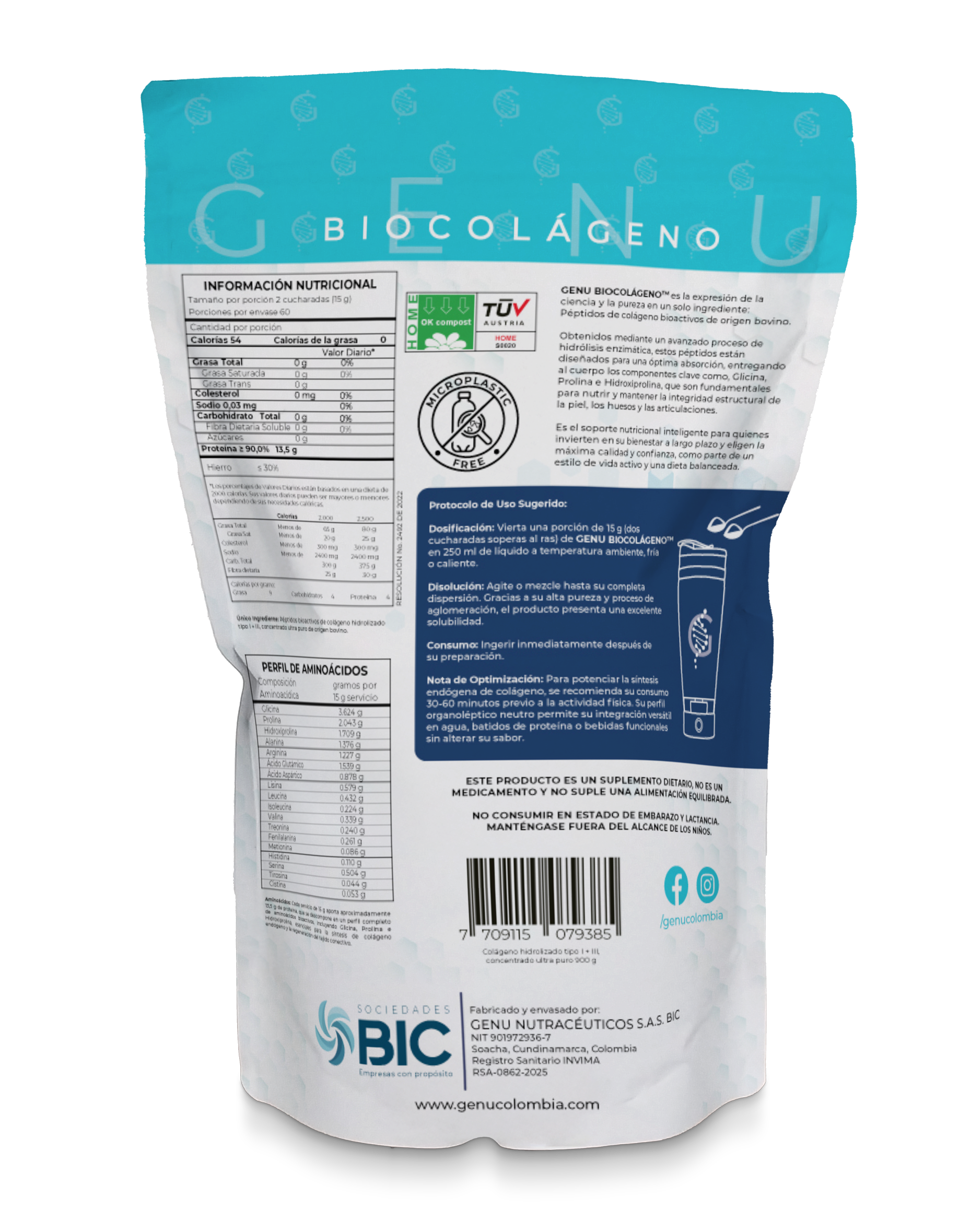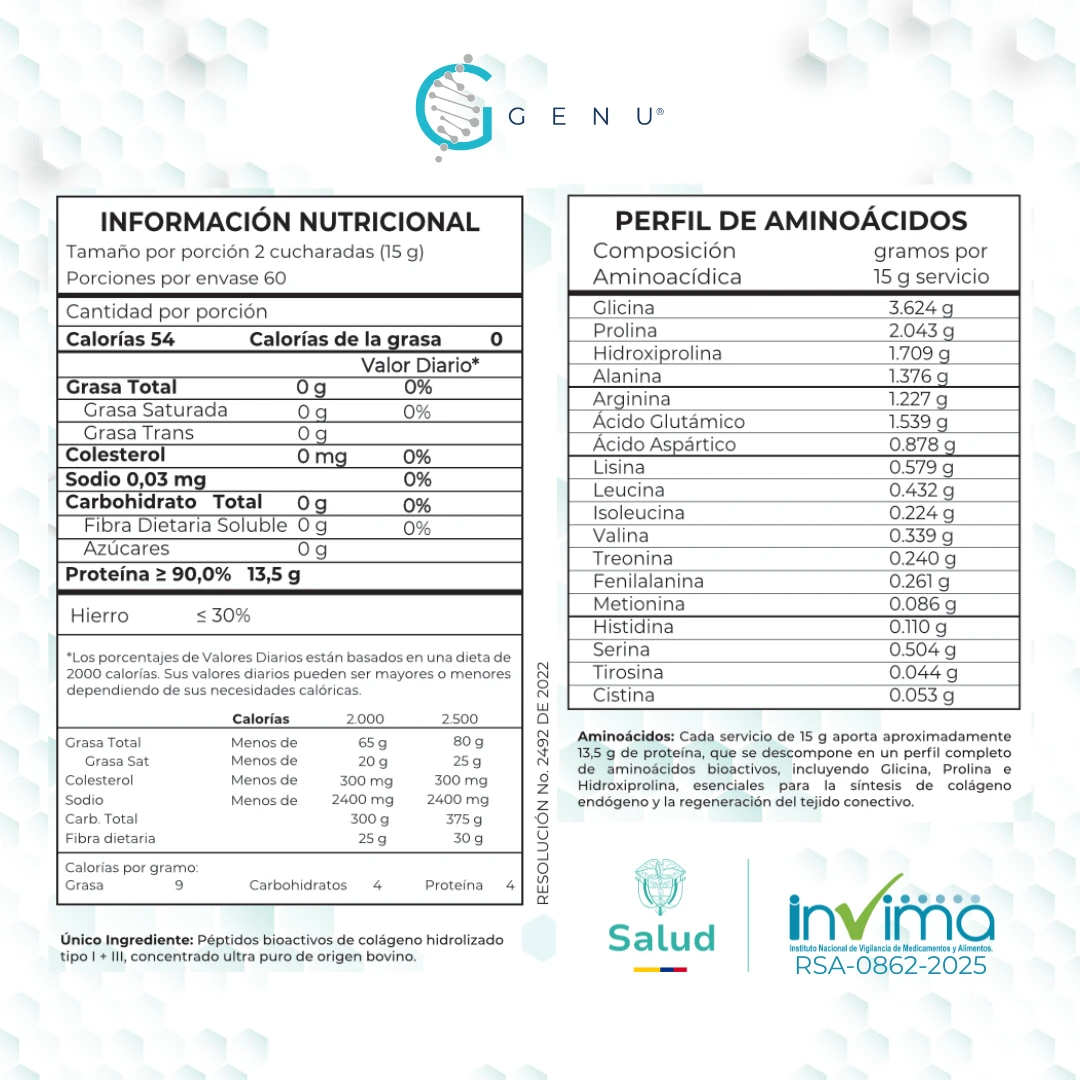 GENU te entrega un dossier completo: INVIMA, FSSC 22000, y un perfil de aminoácidos claro. Es la certeza que necesitas para tus pacientes.